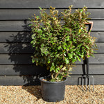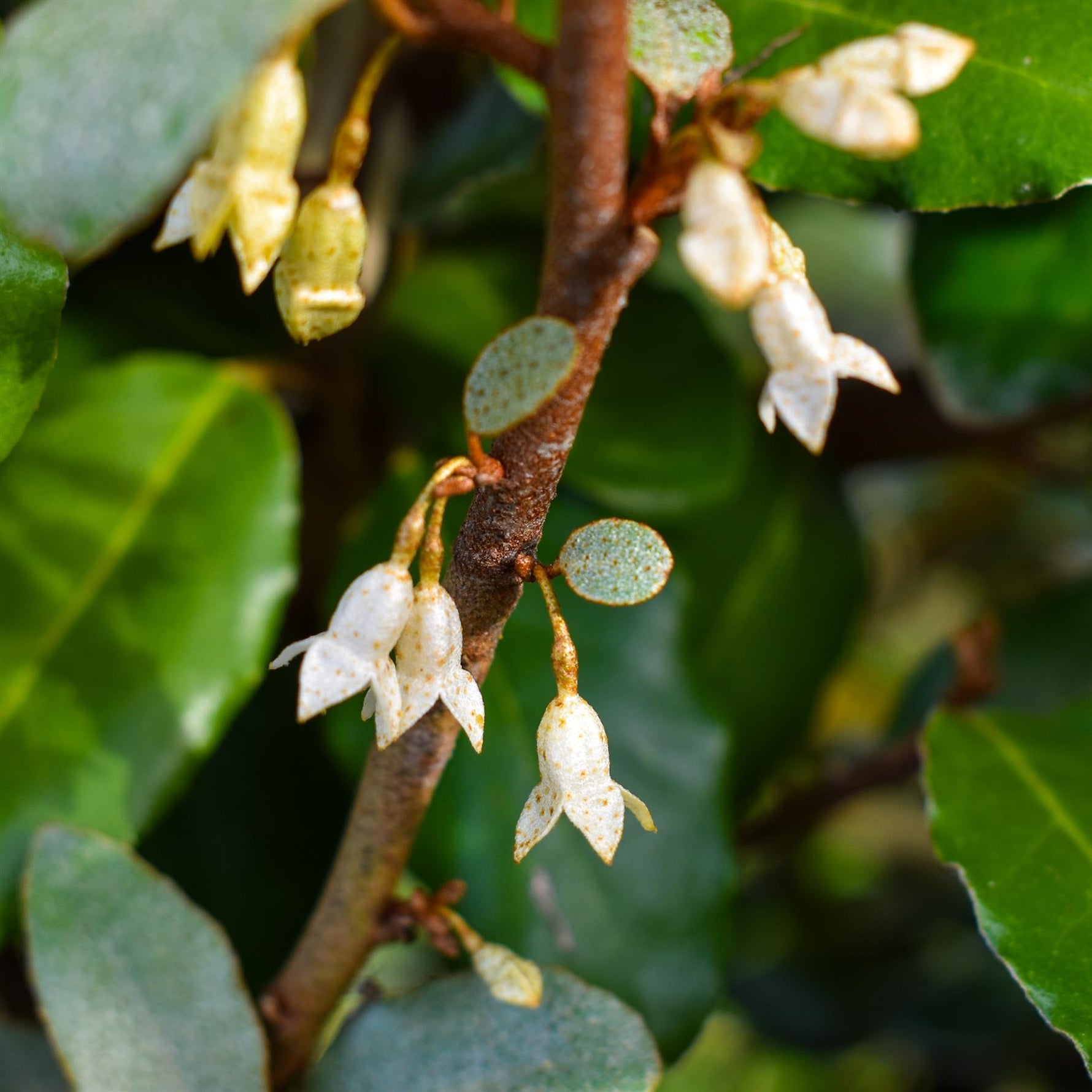 Elaeagnus ebbingei Compacta is a compact, dense, fast-growing, evergreen shrub with colourful twigs and branches – colours range from orange-brown, honey to sandy yellow. Leathery, glossy dark green leaves have silver undersides. Flowers are small, creamy, inconspicuous, but have nice, sweet fragrance. They bloom from late summer to autumn and are followed by deep red, edible fruit. Elaeagnus ebbingei Compacta can grow in wide varieties of soils, as long as they are well-drained. It prefers average, medium moisture, well-drained soil, in full sun or partial shade. Once established, it can withstand drought, wind, and salt spray. In very cold climates, its shallow roots should be protected from frost. Generally, pest-free. Low maintenance. Elaeagnus ebbingei Compacta, with its compact habit and lovely silvery-green foliage, is a great addition to any garden – informal, cottage, urban or coastal. It is perfect as a background plant, for hedges and screens, in shrub borders, or planted in containers.