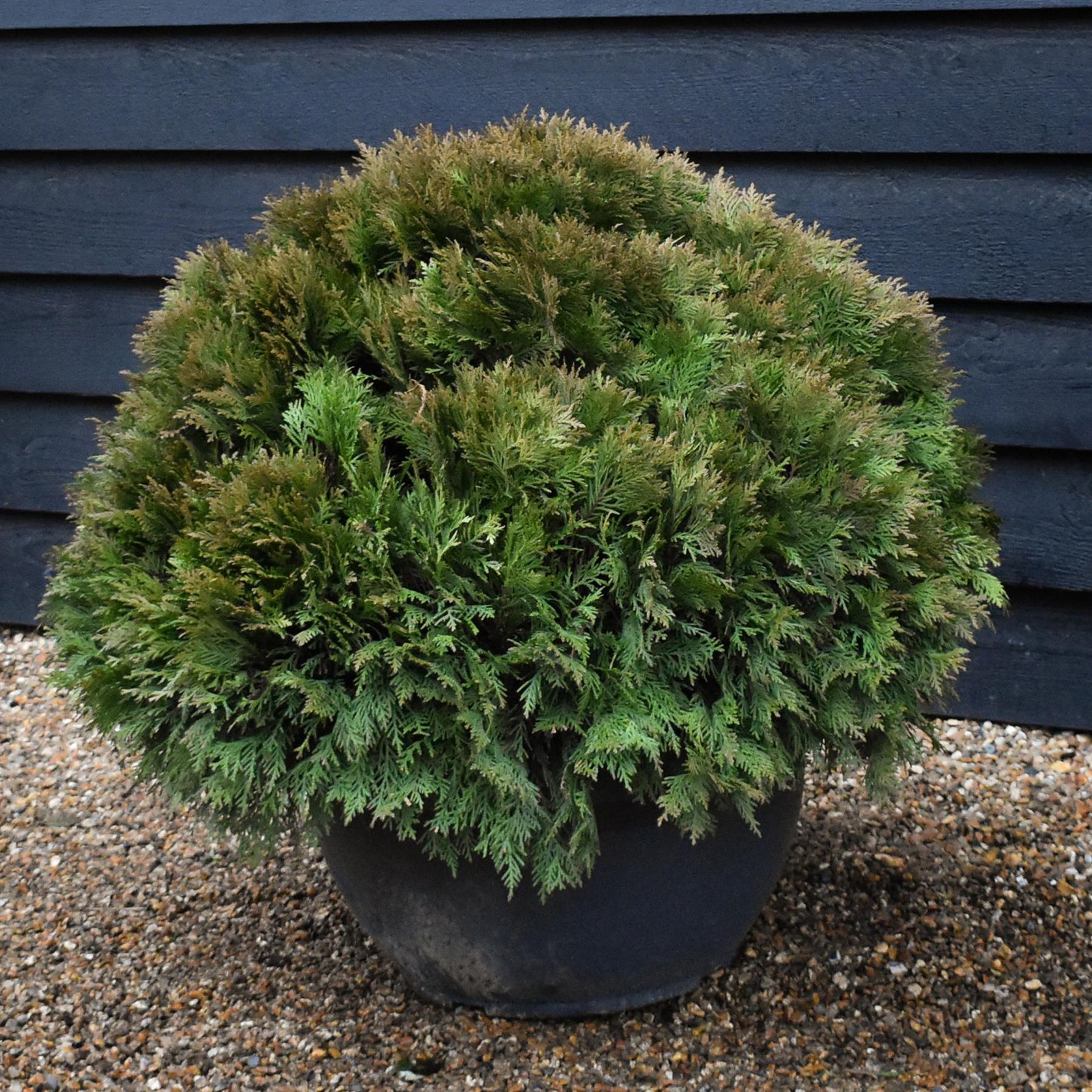 Thuja occidentalis ‘Danica’ grows best in full sun to light shade, with sun helping to maintain its compact shape and healthy colour. It prefers moist but well-drained soil, and will tolerate a range of soil types, including clay, provided drainage is adequate. Once established, it is reasonably hardy and resilient, coping well with typical UK weather conditions.