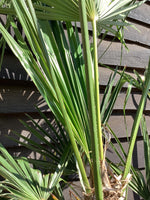 Trachycarpus fortune, or Chinese Windmill Palm, is a dioecious, evergreen palm tree with a stout trunk covered with hairy, black fibres from old leaf sheaths, and deeply divided, fan-shaped, dark green leaves. Large, dropping panicles of small, light yellow flowers bloom in summer and are followed by dark blue fruits on female plants. Chinese Windmill Palm grows best in rich, moderately fertile, moist, well-drained soils. It prefers partial shade to full sun and locations sheltered from cold, drying winds and winter frosts. Plant crown may need protection. Of all the trunked palms, this one has the best winter hardiness. Drought tolerant. Generally, pest-free and disease-free. Very easy to grow. Trachycarpus fortune is an excellent palm tree, perfect for bringing tropical vibes into the landscape. Great as a specimen plant or planted in groups. Suitable for growing in large containers and brought inside in very cold climates.