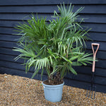 A multi-stem Trachycarpus fortunei, standing at a height of 150-160 cm, is a captivating and exotic addition to any garden or landscape. This hardy palm showcases multiple slender trunks, each wrapped in a distinctive fibrous, brownish bark, creating an appealing textured appearance. The vibrant green, fan-shaped fronds radiate elegantly from the top of each stem, adding a lush, tropical ambiance to the surroundings. Despite its exotic look, this palm is exceptionally resilient, withstanding cold temperatures and thriving in a variety of soil types. Ideal for creating a naturalistic or architectural focal point, this compact yet mature palm is perfect for patios, sheltered outdoor spaces, or as a striking centerpiece in garden beds and tropical-themed landscapes.