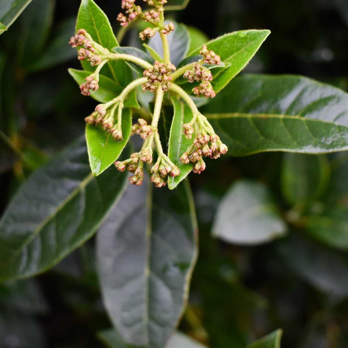 Viburnum tinus ‘Eve Price’ is a medium-sized, bushy, dense, winter-flowering, evergreen shrub with leathery, broadly oval, dark green leaves, and cluster of small, starry, white flowers opening form deep pink buds and blooming from December to March. Flowers are followed by ornamental, glossy, dark blue berries. Viburnum tinus ‘Eve Price’ can adapt to a wide range of soil conditions, but thrives in fertile, humus-rich, moist, well-drained soils. Very adaptable, it can grow in full sun, partial shade, and even full shade. Once established, it is resistant to drought. It can withstand wind, exposed positions, and coastal conditions. Low maintenance plant, doesn’t require much pruning. Viburnum tinus ‘Eve Price’ is a tough, beautiful, winter-flowering plant, great for cottage, urban, and coastal gardens. Excellent for brightening shady garden corners or bare winter gardens. Perfect for shrub borders, informal hedges and screens, and foundation plantings. Good as a specimen or accent plant.