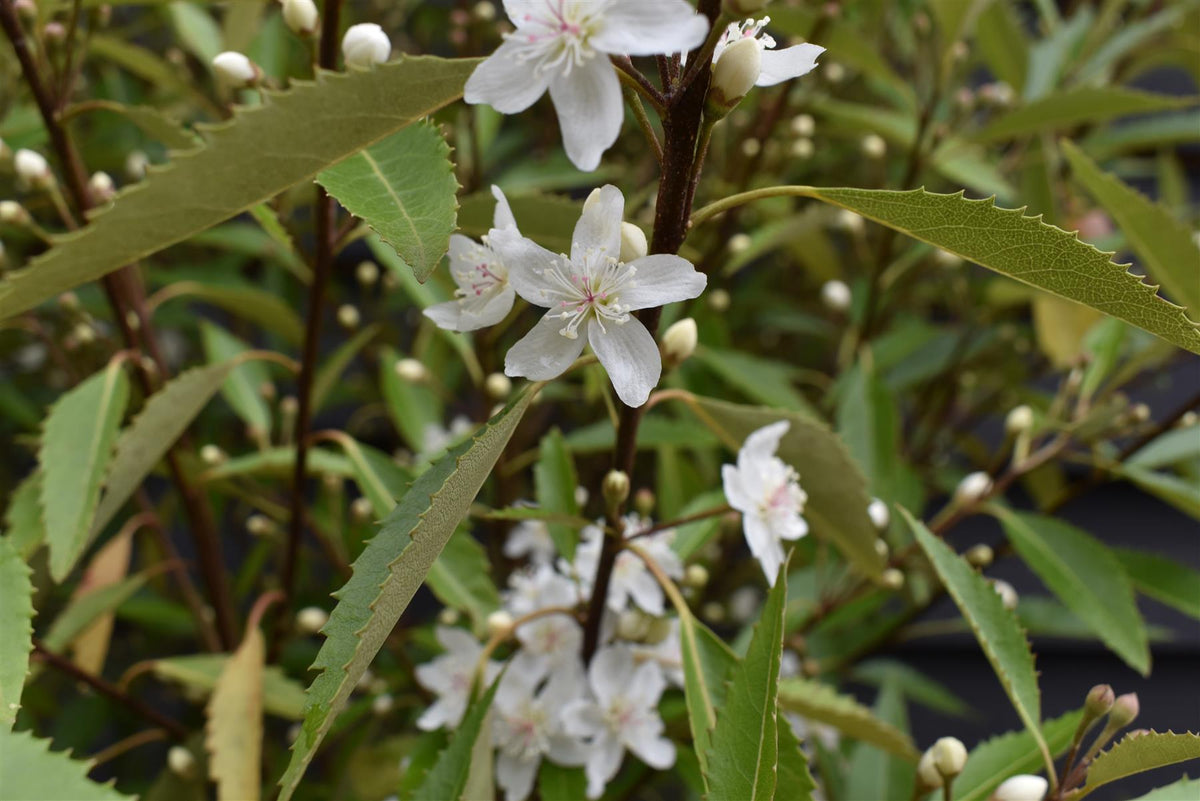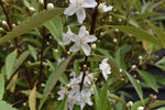 Hoheria sexstylosa ‘Snow White’ is an attractive, evergreen shrub or small tree of pyramidal shape, with attractive, peeling bark, and ovate, sharply toothed, glossy green leaves. Masses of beautiful and delicate, fragrant, star-shaped, white flowers, resemble cherry blossom and bloom throughout summer. Attractive to bees and butterflies. Hoheria sexstylosa ‘Snow White’ prefers fertile, neutral to alkaline, moist, well-drained soils but can adopt to any type of soil as long as it is well-drained. It thrives in full sun or partial shade. It needs to be sheltered from cold, dry winds and roots should be protected in winter with mulch. Generally, pest-free and disease-free. This beautiful evergreen shrub with lovely summer flowers is a great addition to any informal, cottage, urban or coastal garden. If heavily pruned, it can be turned into an attractive evergreen hedge and provide privacy and some wind protection. Perfect for shrub borders, wall-side borders, hedges and screens.