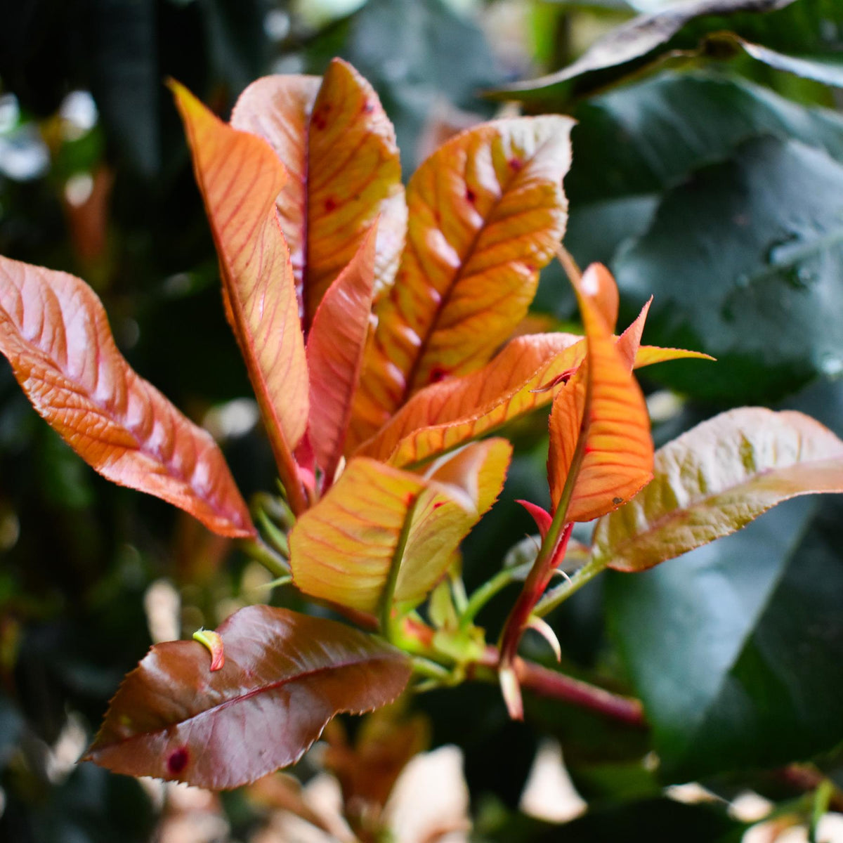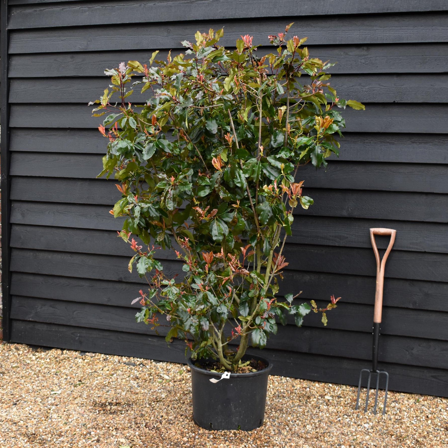 Photinia × fraseri ‘Magical Volcano’ is a new, improved photinia, a cross between Fraser’s hedging photinia and Chinese photinia serratifolia. It’s a large, evergreen shrub with stunning, colourful leaves with pronounced serrated edges. The leaves are fiery red when young, dark green when mature, and coppery-red in autumn and winter. Panicles of creamy-white flowers bloom in late spring and are sometimes followed by red berries. Photinia × fraseri Magical Volcano can adapt to a wide range of soils, but prefers fertile, humus-rich, moist, well-drained soils. It thrives in full sun and the best leaf colour is achieved in full sun. It can withstand frost, but needs to be sheltered from drying, winter winds. Generally, disease-free. May require some pruning. Christmas berry ‘Magical Volcano’ is a gorgeous evergreen shrub with strong and long-lasting colour, ideal for dense, compact, and attractive hedges and screens. It is also great as a standalone shrub.