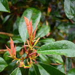 Photinia x fraseri 'Red Robin' is a New Zealand selection of Fraser's Photinia. It’s a large, evergreen shrub or small tree with leathery, oval, glossy, brilliant, bright red leaves when they emerge, and dark green after several weeks. Small, 5-petal, white flowers bloom in spring and are rarely followed by red fruits which can persist throughout winter. Spring pruning eliminates flowers and stimulates new red growth. Photinia x fraseri 'Red Robin' grows best in average, fertile, slightly acidic, medium moisture, well-drained soils, but is adaptable to a wide range of soils, except waterlogged and compact. Once established, it is resistant of frost and drought. Young leaves may be damaged by late frosts, therefore it should be sheltered, especially from harsh winds. Low maintenance plant. Photinia x fraseri 'Red Robin' is a very popular evergreen shrub, great as a specimen or accent plant, but perfect for hedges and screens, useful for noise reduction, or wind protection.