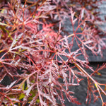 Acer palmatum 'Garnet' is a medium-sized, vigorous deciduous shrub with a bushy, dense, capriciously growing, cascading habit and smooth, grey-brown bark. It has beautiful, feathery, deeply cut, red leaves that resemble the colour of garnet stone in spring and summer, and turn scarlet in autumn. Small, inconspicuous, purplish flowers bloom in spring and are followed by pink, winged fruits. It can grow in any soil type except clay, but thrives best in moist, well-drained, slightly acidic soil. It prefers partial shade, but tolerates full sun very well. Easy to care for, it requires very little pruning. Lack of soil moisture or excessive exposure can cause leaf scorch. Acer palmatum 'Garnet' is a wonderful shrub that really stands out in the landscape and is probably the most used among similar cultivars. It is stunning as specimen plant, perfect for cottage and urban gardens, rock gardens, and roof gardens. Suitable for growing in containers as well.