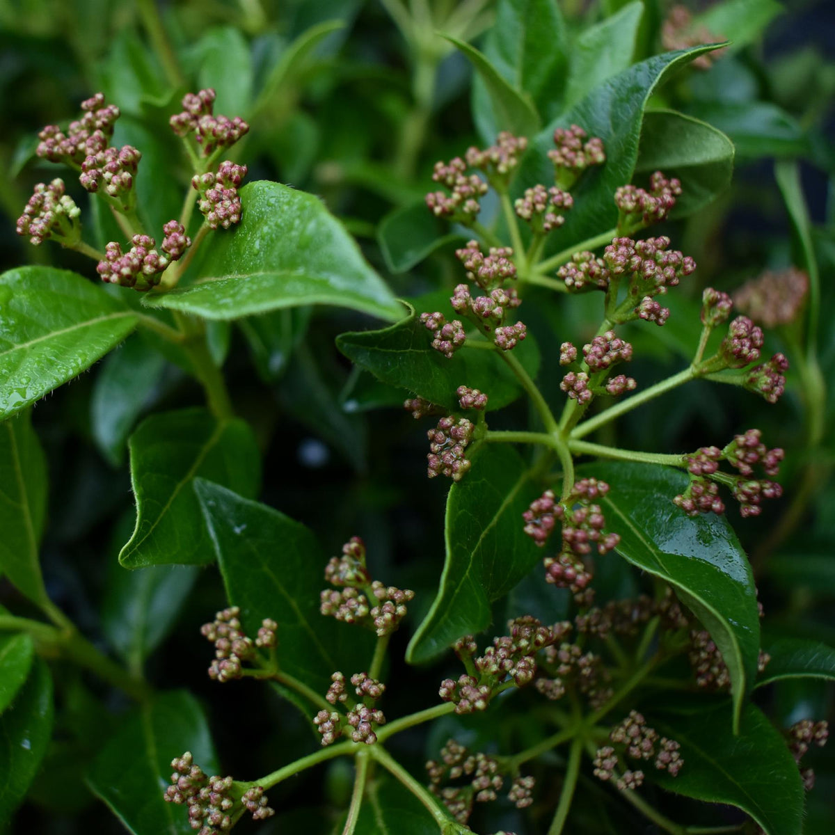 Viburnum tinus ‘Eve Price’ is a medium-sized, bushy, dense, winter-flowering, evergreen shrub with leathery, broadly oval, dark green leaves, and cluster of small, starry, white flowers opening form deep pink buds and blooming from December to March. Flowers are followed by ornamental, glossy, dark blue berries. Viburnum tinus ‘Eve Price’ can adapt to a wide range of soil conditions, but thrives in fertile, humus-rich, moist, well-drained soils. Very adaptable, it can grow in full sun, partial shade, and even full shade. Once established, it is resistant to drought. It can withstand wind, exposed positions, and coastal conditions. Low maintenance plant, doesn’t require much pruning. Viburnum tinus ‘Eve Price’ is a tough, beautiful, winter-flowering plant, great for cottage, urban, and coastal gardens. Excellent for brightening shady garden corners or bare winter gardens. Perfect for shrub borders, informal hedges and screens, and foundation plantings. Good as a specimen or accent plant.