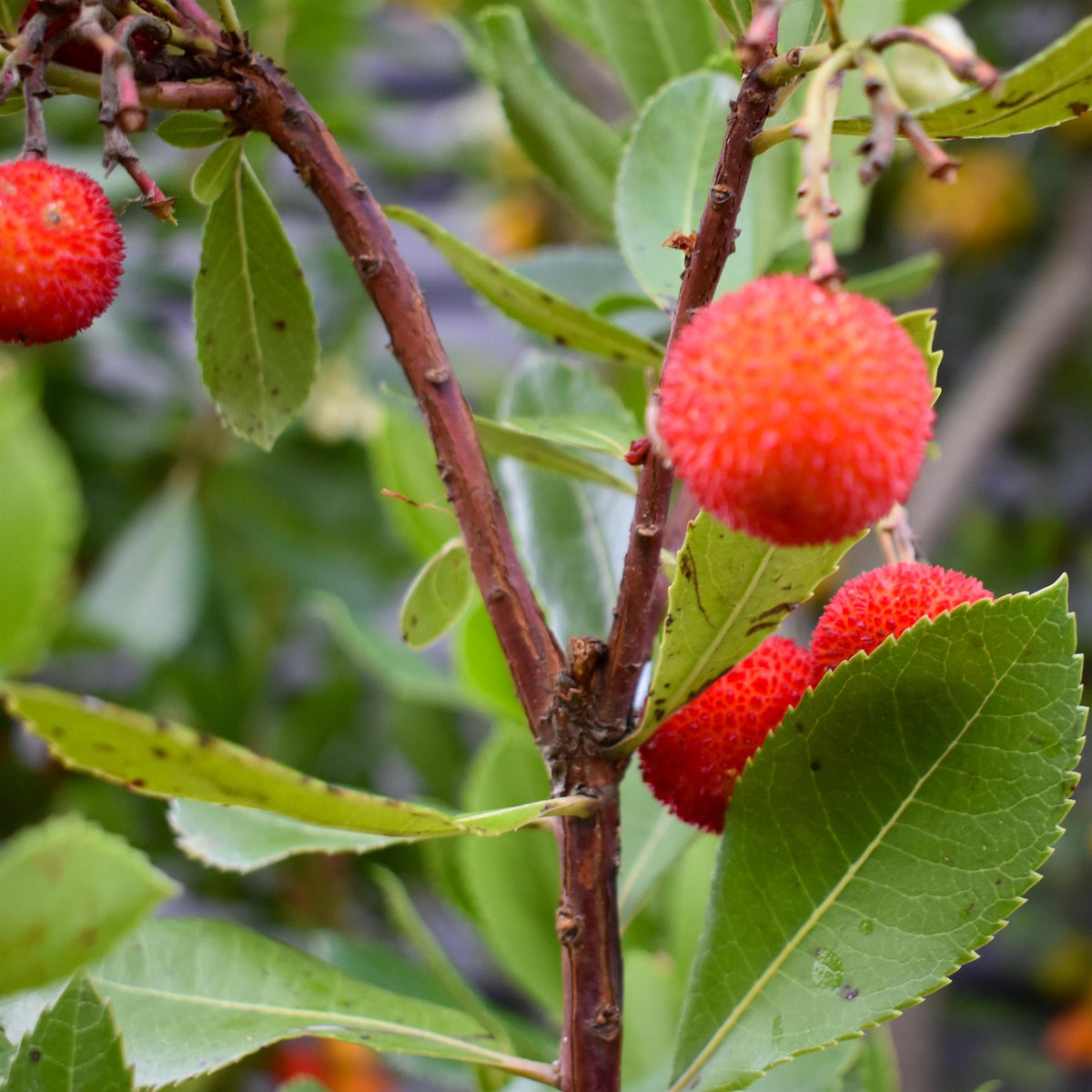 Arbutus unedo, commonly known as the strawberry tree, can make an excellent large multistem specimen for a garden, provided the conditions suit its needs. This evergreen tree naturally forms multiple stems, creating a sculptural, architectural presence that adds year-round interest. Its attractive cinnamon-peeling bark, glossy dark green leaves, and the unusual combination of flowers and fruit appearing at the same time make it a standout ornamental choice.