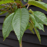 Prunus avium 'Van' is a deciduous fruit tree that produces delicious cherries. This variety is known for its large, firm, and sweet fruit that ripens in mid to late season. The cherries are dark red in color with a glossy finish and a crisp texture.