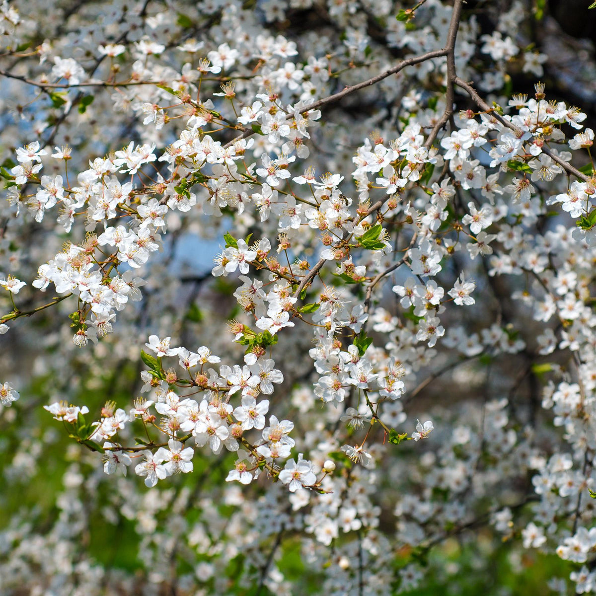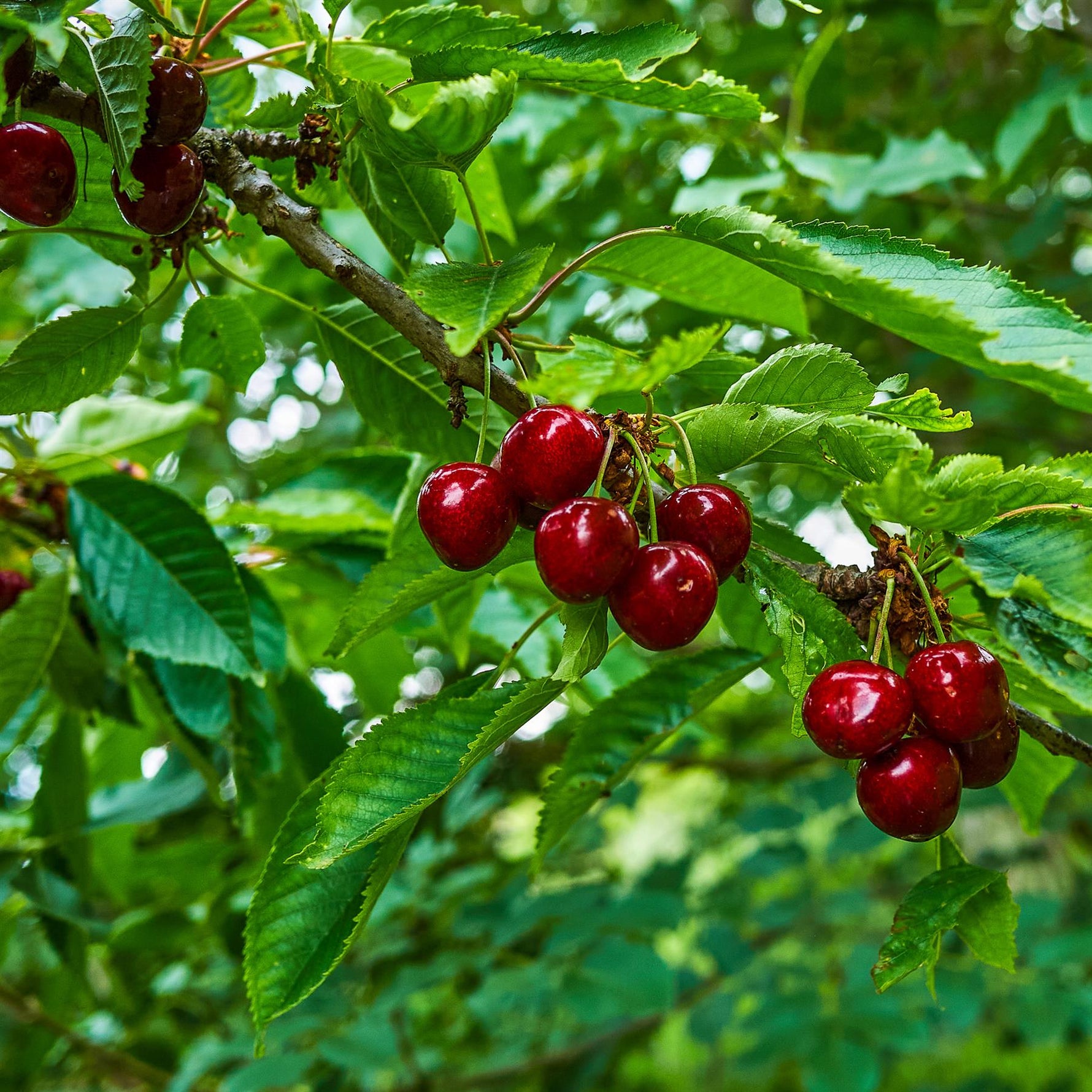 Prunus avium, or Wild Cherry, is a medium-sized deciduous cherry tree, with brown bark, silvery when mature, and serrated, dark green leaves, yellow and orange in autumn. The clusters of pure white flowers bloom in late spring and are followed by small, glossy, red-purple cherries, edible but a bit bitter, ready for harvesting in summer or autumn. Attractive to bees and birds. Toxic for pets. Wild Cherry thrives in average, medium moisture, well-drained soils, in full sun. It can adapt to a wide range of soils, but doesn’t tolerate too wet soils, therefore, good drainage is essential. It can withstand frost, but needs to be sheltered from harsh winds. Late frosts may damage the flower buds. Needs periodic chemical spraying. Low maintenance plant. Prunus avium is a nice ornamental tree for large informal, cottage and wildlife gardens, great for beds and borders and wall-side borders.