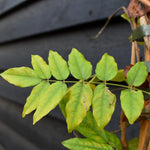 As the plant matures, its twining stems develop a graceful, sculptural quality, weaving around pergolas, arches, and sturdy supports. The foliage is fresh green, pinnate, and lightly textured, providing a beautiful contrast to the dark flower clusters. In summer, the leaves create a soft, ornamental canopy, and in autumn they turn a gentle yellow before falling.