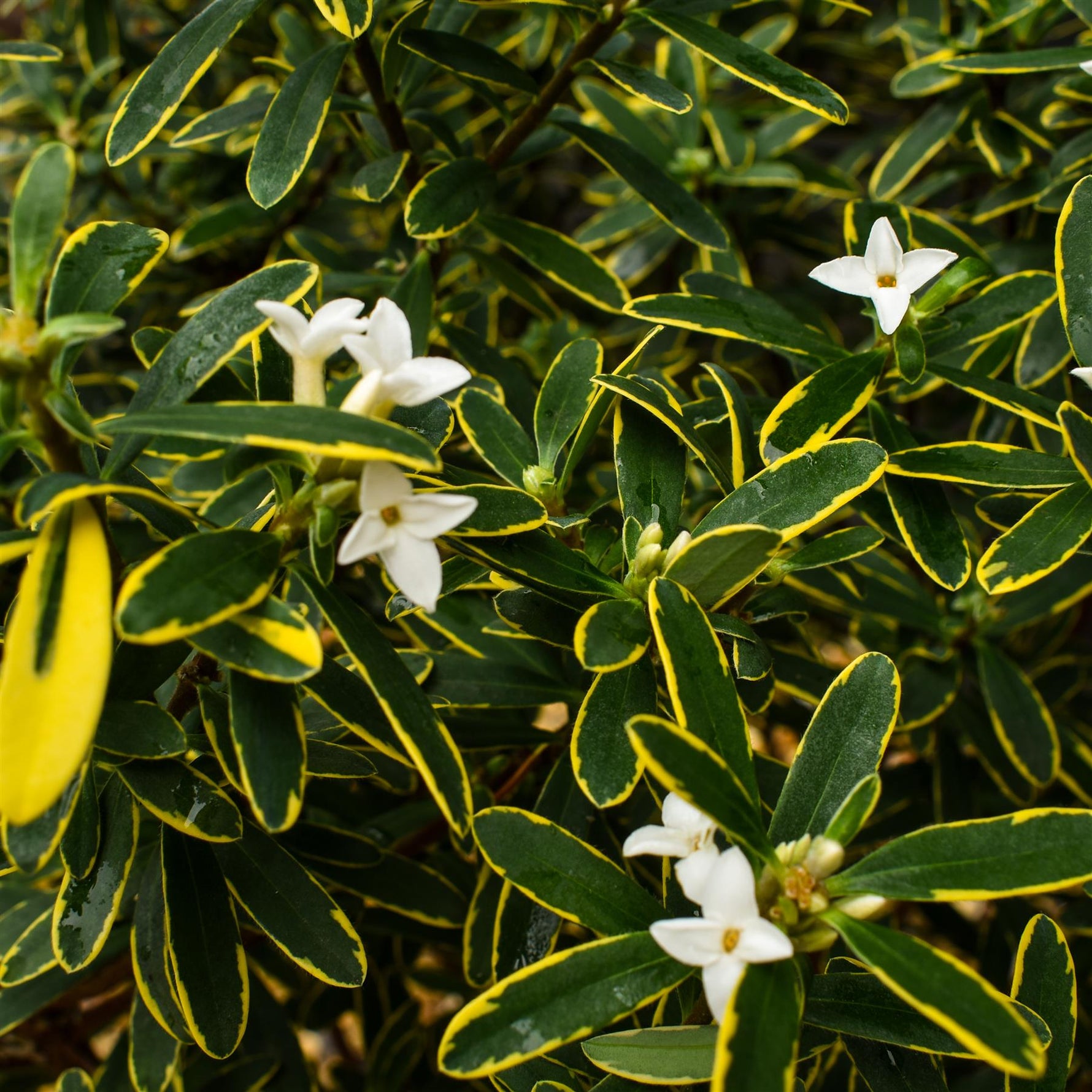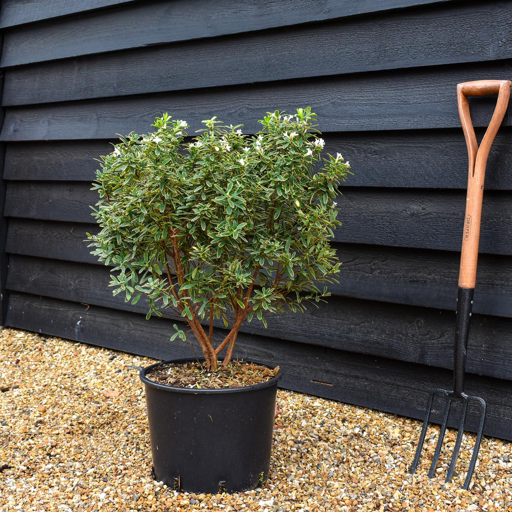 Daphne transatlantica ‘Summer Ice’ is an elegant, compact shrub prized for its long blooming season and striking variegated foliage. Its narrow, evergreen leaves are edged in creamy white, creating a luminous effect in the garden year-round. From late spring through summer, clusters of small, tubular, white flowers emerge, filling the air with a rich, sweet fragrance. Unlike many daphnes, ‘Summer Ice’ is notably long-flowering, often producing a second flush of blooms in early autumn. This variety grows in a neat, rounded shape, typically reaching 2–3 feet tall and wide, making it ideal for borders, containers, or as a standout specimen plant. Best planted in well-drained soil and partial sun, it thrives with minimal maintenance once established. Its combination of variegated foliage, scented blooms, and compact habit ensures year-round interest, making Daphne ‘Summer Ice’ a sophisticated choice for gardeners seeking both beauty and fragrance.