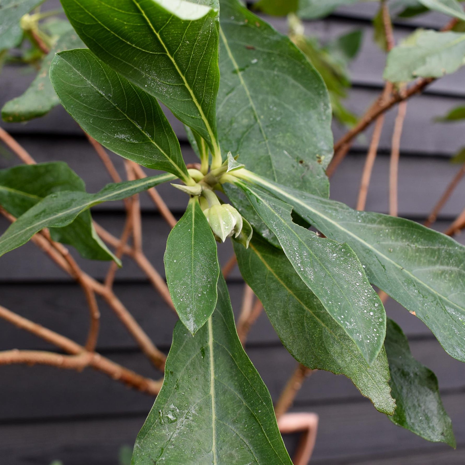 Edgeworthia chrysantha 'Grandiflora' is an attractive, bushy, suckering, long-blooming, deciduous shrub with narrow, dark blue-green leaves. In late winter, large, rounded flower-heads composed of tiny, fragrant, bright yellow flowers appear on bare stems from small, hairy buds. The period of blooming is long, from 4 to 6 weeks providing an exquisite display in winter and early spring. Edgeworthia chrysantha 'Grandiflora' prefers fertile, hummus-rich, loamy, moist but well-drained soils in light dappled shade or full sun. In hot areas, it appreciates protection from the afternoon sun. Intolerant of hot dry summers. Pest-free and disease-free. Doesn’t require pruning. Its inner bark can be used to make quality paper, hence the name Paperbush. Edgeworthia chrysantha 'Grandiflora' is a stunning ornamental plant, attractive all year round. Ggreat addition to any garden – informal, cottage, coastal or urban. It is perfect as a specimen plant, great for wall-side borders, shrub borders, or foundation plantings. Suitable for growing in containers.