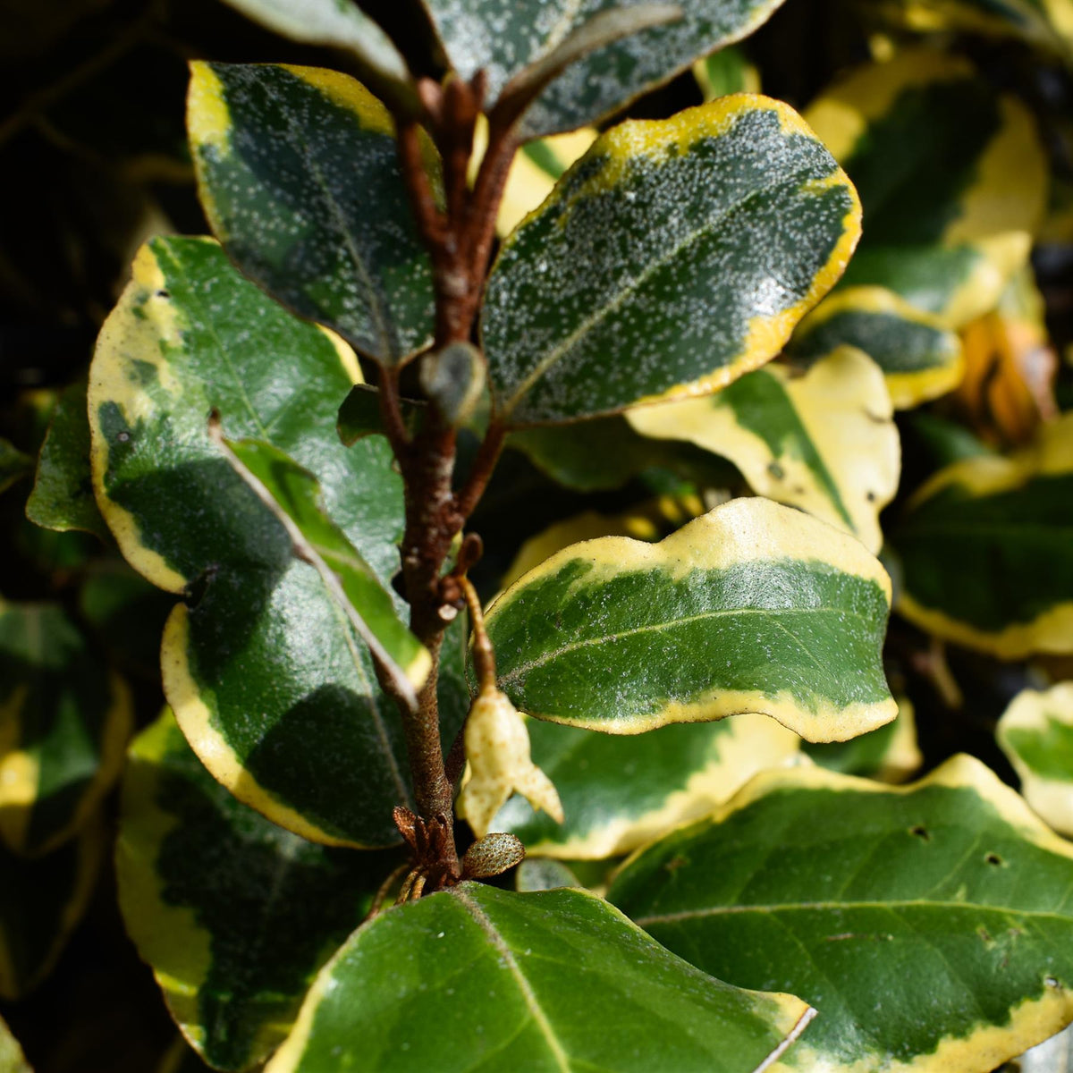 Elaeagnus x submacrophylla 'Viveleg' is a vigorous, dense, vase-shaped, upright, evergreen shrub with oval, leathery, variegated foliage - greyish dark-green leaves with silvery undersides and irregular golden-yellow margins. Small, fragrant, tubular, creamy-white flowers bloom in autumn and are followed by cherry-like, edible fruits. Elaeagnus x submacrophylla 'Viveleg' can grow in almost any type of soil, but it prefers average, moist, and well-drained soils, in full sun to partial shade. It can withstand frost, but its shallow roots need to be protected with mulch. It doesn’t like wet conditions. It is tolerant of dry conditions and coastal winds. Fast growing and vigorous. Almost maintenance-free. May become chlorotic on shallow chalky soils. Elaeagnus x submacrophylla 'Viveleg' is a nice, variegated variety of Silverberry. It is perfect as a background plant, for hedges and screens, in shrub borders, or for banks and slopes. Great for informal, cottage, coastal, and wildlife gardens.