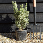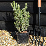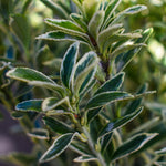 Euonymus japonicus ‘Microphyllus Albovar’ is a charming, slow-growing evergreen shrub, valued for its neat form and attractive variegated foliage. Belonging to the box-leaf euonymus group, this cultivar is particularly compact, making it well-suited for small gardens, edging, or container planting. Its tiny, oval leaves are glossy green, edged with creamy-white margins that provide year-round interest and a refined, decorative effect. The dense, bushy growth habit allows it to be clipped into formal shapes or used as a low hedge, offering a reliable alternative to box (Buxus) in areas where box blight is problematic.