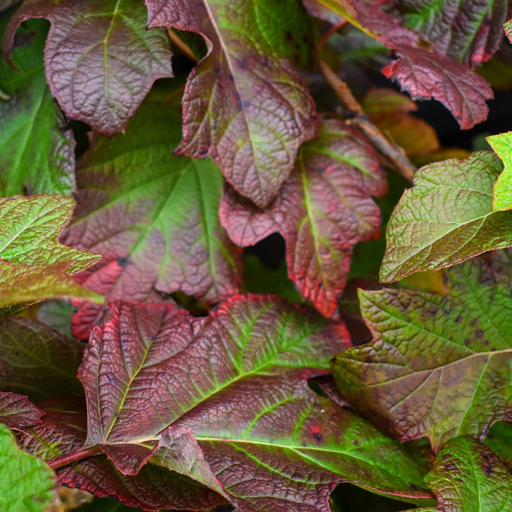 Hydrangea quercifolia, or Oak-Leaved Hydrangea is a spreading, broad-rounded, multi-stemmed, suckering, deciduous shrub with large, deeply lobed, oak-shaped, dark-green leaves, red and purple in autumn. Creamy-white flowers in conical panicles with large sterile florets bloom in summer and autumn. Hydrangea quercifolia 'Ruby Slippers' grows well in a wide range of soils, but prefers humus-rich, slightly acidic, medium moisture, well-drained soils. It thrives in full sun and partial shade. Resistant to frost, but needs to be sheltered from harsh winter winds. Tolerant of air pollution and urban conditions. Generally, pest-free and disease-free. Low maintenance plant, requires minimal pruning. Oak-Leaved Hydrangea is a wonderful, easy to grow shrub, suitable for informal, cottage, woodland, and urban gardens. Great as a specimen or accent plant or planted in groups and masses. Excellent for shrub and mixed borders or informal hedges and screens. Good for foundation plantings, flower beds, or as a ground cover.