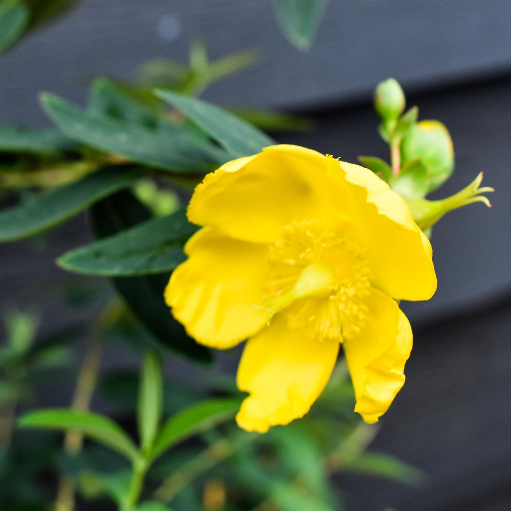 Hypericum x hidcoteense 'Hidcote' is a beautiful, spreading, compact, dense, semi-evergreen shrub with numerous slender, reddish stems and tidy, narrowly ovate, blue-green leaves. Large, cup-shaped, 5-petal, waxy, golden yellow flowers with golden stamens and orange anthers bloom in summer and autumn. They are followed by bright-red, oval fruits. Hypericum x hidcoteense 'Hidcote' can grow in a wide variety of soils, including rocky and sandy, but prefers average, moist and well-drained soils. It thrives in full sun to partial shade. Tolerant of drought, maritime exposure, and cold, but in colder climates it dies to the ground in winter. Generally, pest-free and disease-free. Low maintenance plant. This hybrid is one of the most popular and resilient Hypericums. It is great as an accent plant, in shrub borders and mixed borders, banks and slopes, or as a lovely, flowering, low hedge or screen. It mixes well with herbaceous perennials. Perfect for cottage, coastal, and urban gardens.