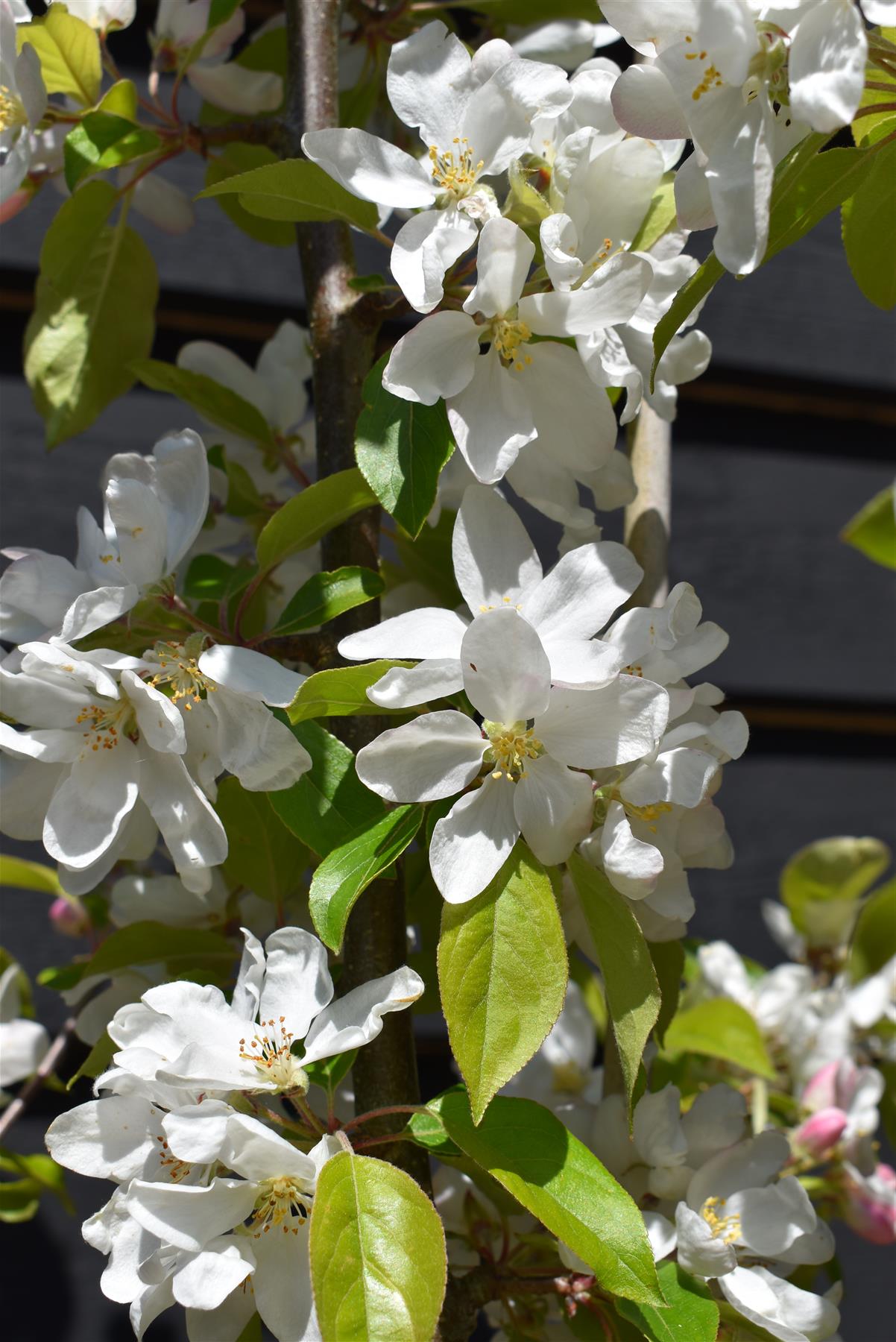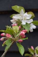 Malus ‘John Downie’ is an ornamental, deciduous tree with wide, oval to round, half-open crown, and ovate, glossy, green leaves, buttery-yellow in autumn. Lovely, single, white flowers that open from pink buds, bloom in May and are followed by plum-like, firm and crunchy, orange-red fruits, that remain on branches throughout the winter. These crab apples are tasteful and great for jams and jellies. Attractive to birds and bees. Malus ‘John Downie’ can grow well in almost any type of soil, as long as it is well-drained, but thrives in moderately fertile, medium moisture, well-drained soils in full sun or partial shade. Once established, it is resistant to drought. It can withstand frost, wind, and urban pollution. Generally, disease-free. Low maintenance plant, doesn’t require much pruning. Malus ‘John Downie’ is a lovely ornamental tree, ideal for smaller informal, cottage and urban gardens. It is very popular for its delicious fruits great for culinary use.