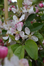 Malus x zumi 'Golden Hornet' is a vigorous, medium-sized, deciduous tree with broad oval crown, ovate, green leaves, yellow in autumn, and a profusion of fragrant, pink-white flowers, opening from pink buds and blooming in late spring. Flowers are followed by heavy crops of edible, golden-yellow fruits in autumn, persisting on bare branches in winter. Great for jellies and jams. Attractive to birds and bees. Malus x zumi 'Golden Hornet' prefers fertile, deep, loamy, moist, and well-drained soils, but tolerates many different soil types, except too wet. It thrives in full sun to partial shade. Resistant to frost and urban pollution. Low maintenance, doesn’t require much pruning. A self-fertile plant that can be used as a pollinator for other fruit trees. It can be susceptible to scab. Crab Apple ‘Golden Hornet’ is an attractive ornamental tree, perfect for informal, cottage, and urban gardens. Great as a specimen plant and suitable for growing in containers.