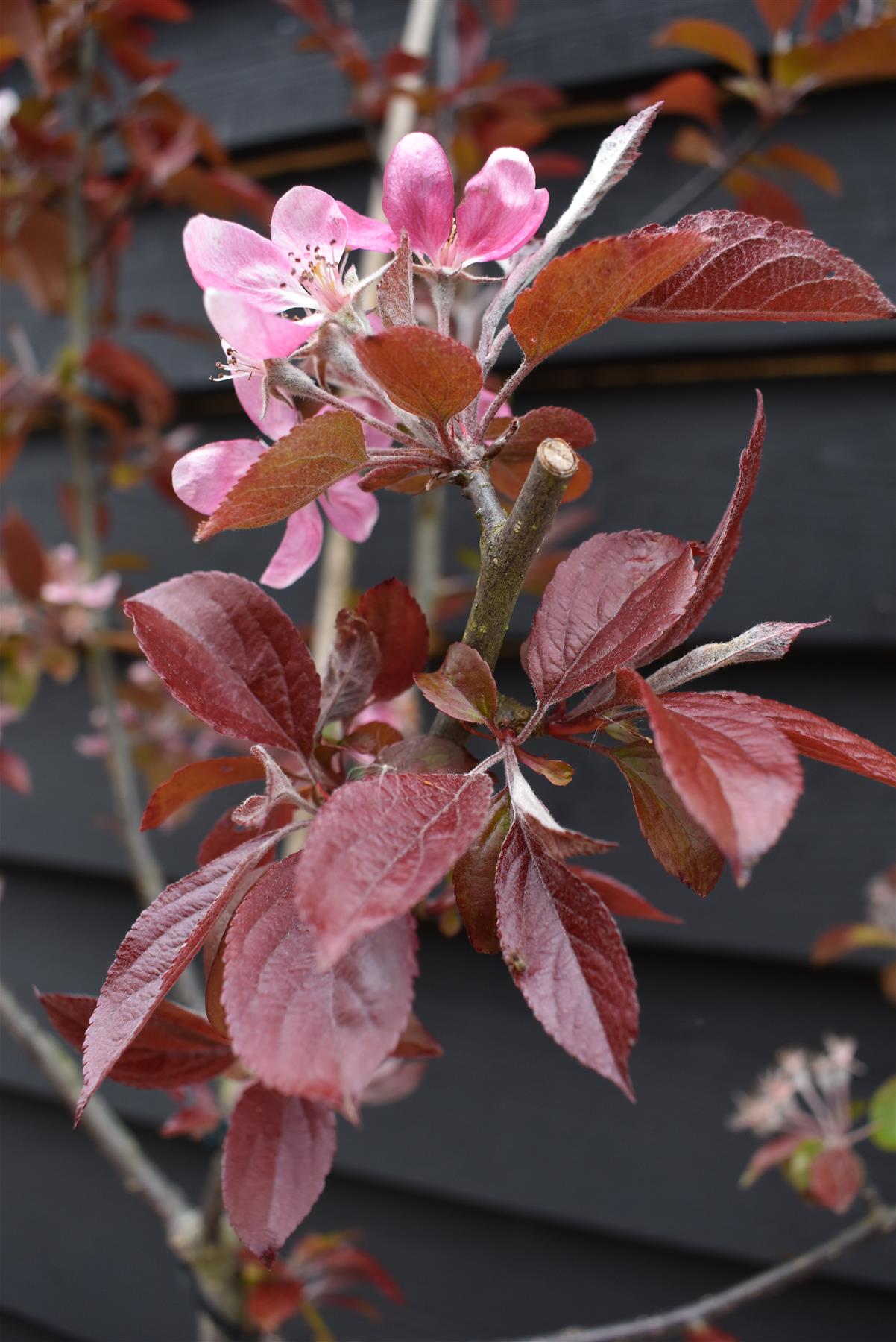 Malus ‘Neville Copeman’, or Purple Crab Apple, is a medium-sized, upright, deciduous tree with irregular, wide, ovoid, half-open crown, and attractive foliage – purple when young and green flushed with purple later. Lovely, lilac-pink flowers bloom in spring and large, tasteful, waxy, purplish-red fruits ripe in autumn. Fruits are great for making jams, jellies and chutneys. Malus ‘Neville Copeman’ can grow well in almost any type of soil, as long as it is well-drained, but thrives in moderately fertile, deep, moist, well-drained soils, in full sun or partial shade. Once established, it is resistant to drought. It can withstand frost, wind, and urban pollution. Low maintenance plant, doesn’t require much pruning. It is self-fertile, therefore, useful as a pollinator for other apple trees. Purple Crab Apple ‘Neville Copeman’ is popular for its attractive foliage, flowers, and large crab apples. It is great as a specimen plant in smaller gardens, suitable for urban areas, and for growing in containers.
