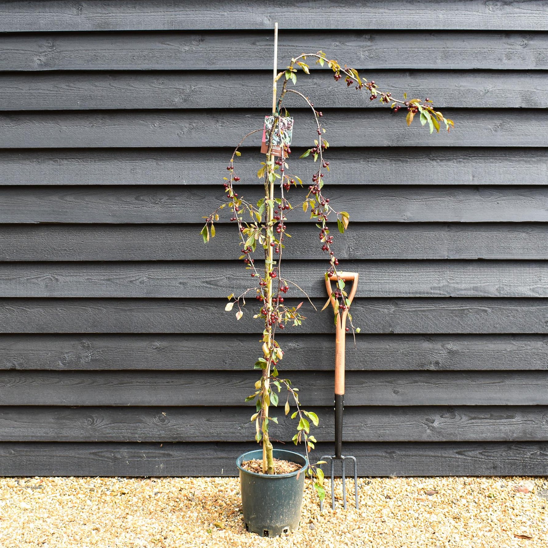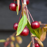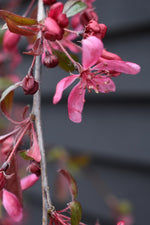 Malus ‘Royal Beauty’ is a small, weeping, deciduous tree with a cascading, dark green leaves, deep-purple underneath, yellow and bronze in autumn, and clusters of fragrant, deep-pink to light-purple flowers along the branches, blooming in spring. Small, dark-purple, cherry-like, non-edible fruits ripen in autumn and persist on bare branches in winter. Malus ‘Royal Beauty’ can grow well in a wide range of soils, but prefers moderately fertile, deep, loamy, medium moisture, well-drained soils. It thrives in full sun, but tolerates partial shade. Once established, it is resistant to drought. It can withstand frost, wind, coastal conditions, and urban pollution. Low maintenance plant, requires minimal pruning. It’s a self-fertile plant, useful as a pollinator for other plants. Crab Apple 'Royal Beauty' is a highly ornamental tree with elegant weeping branches, perfect for small informal, cottage, coastal and urban gardens. Great as a specimen or accent plant, excellent for beds and borders.