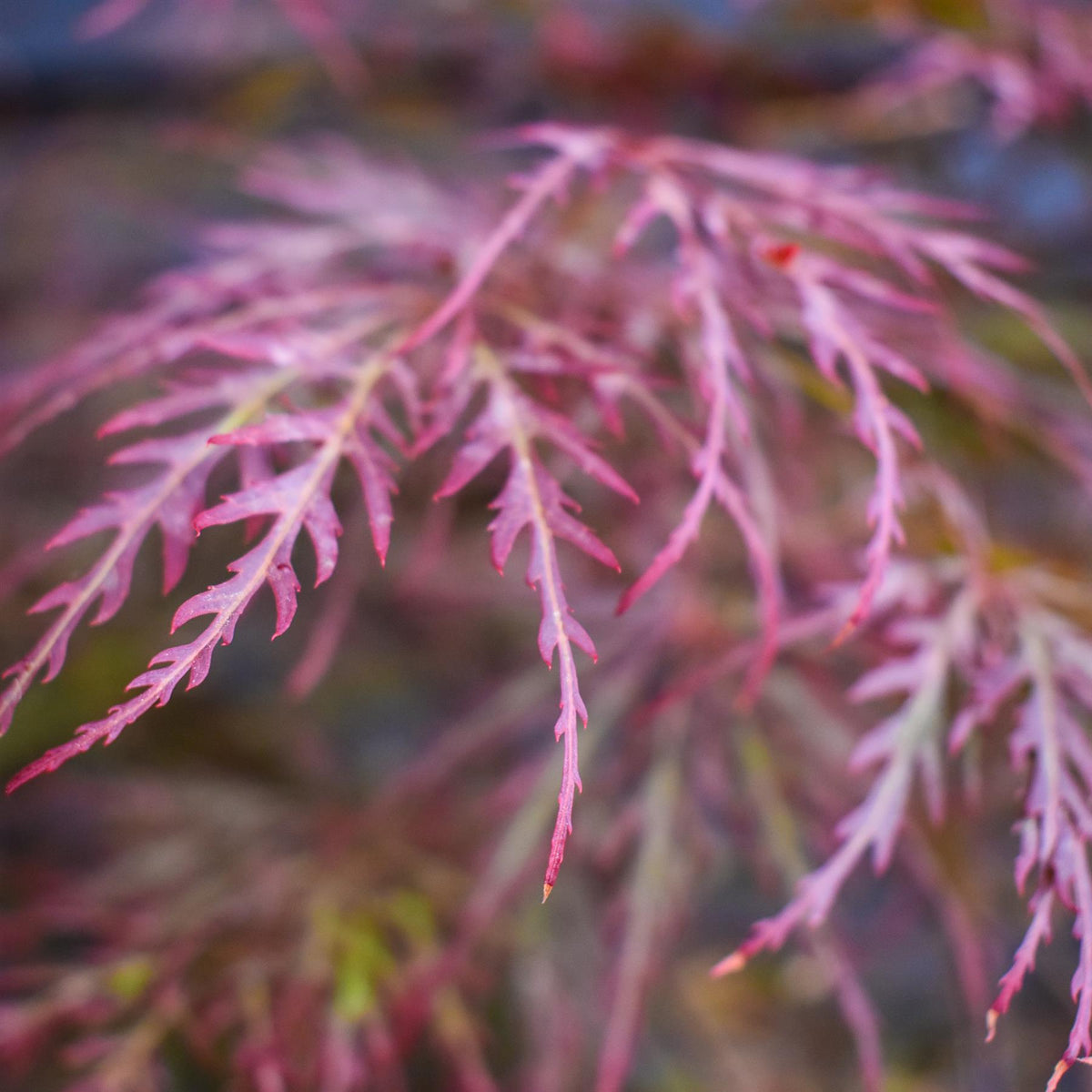 Acer palmatum 'Garnet' is a medium-sized, vigorous deciduous shrub with a bushy, dense, capriciously growing, cascading habit and smooth, grey-brown bark. It has beautiful, feathery, deeply cut, red leaves that resemble the colour of garnet stone in spring and summer, and turn scarlet in autumn. Small, inconspicuous, purplish flowers bloom in spring and are followed by pink, winged fruits. It can grow in any soil type except clay, but thrives best in moist, well-drained, slightly acidic soil. It prefers partial shade, but tolerates full sun very well. Easy to care for, it requires very little pruning. Lack of soil moisture or excessive exposure can cause leaf scorch. Acer palmatum 'Garnet' is a wonderful shrub that really stands out in the landscape and is probably the most used among similar cultivars. It is stunning as specimen plant, perfect for cottage and urban gardens, rock gardens, and roof gardens. Suitable for growing in containers as well.