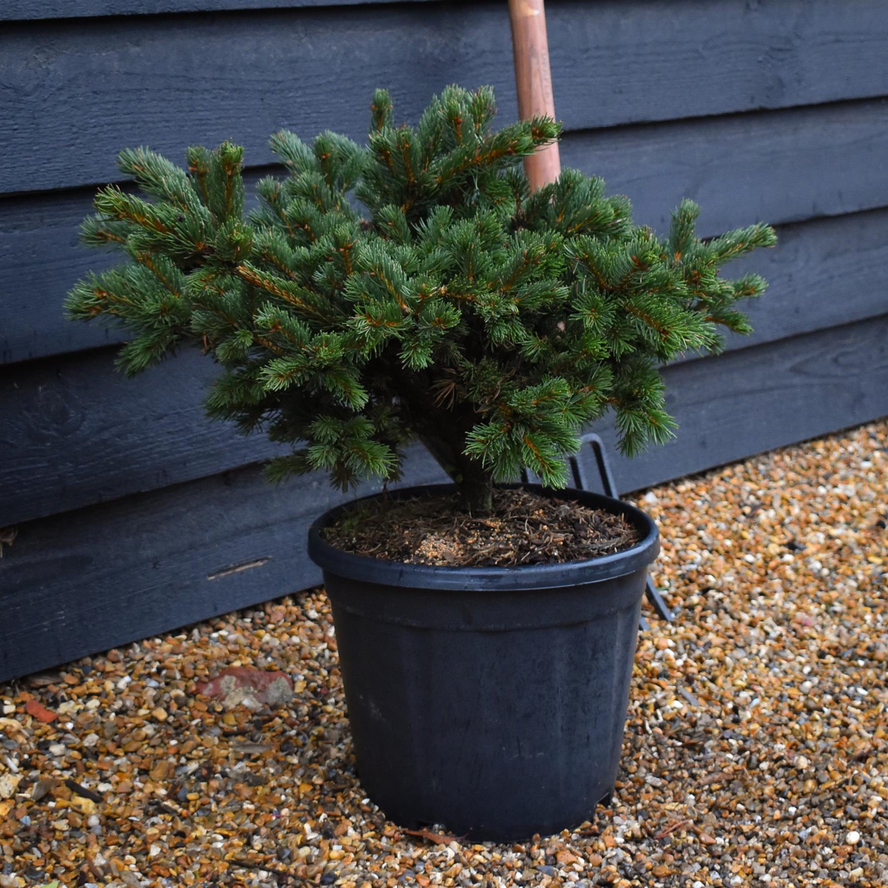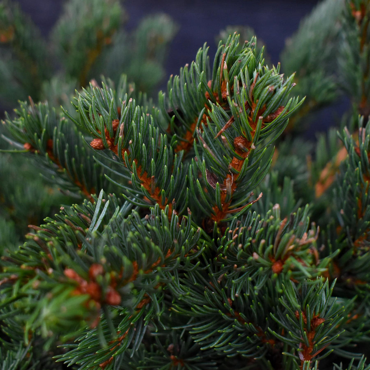The needles of 'Lucky Strike' are bright green when they emerge in spring, later darkening to a rich green as the season progresses. The plant's distinctive feature is its reddish-brown buds, which contrast strikingly against the bright needles, adding visual interest throughout the year, especially in winter. Its short, stiff branches and compact growth habit make it a wonderful option for small gardens, rockeries, or as a focal point in a mixed border.