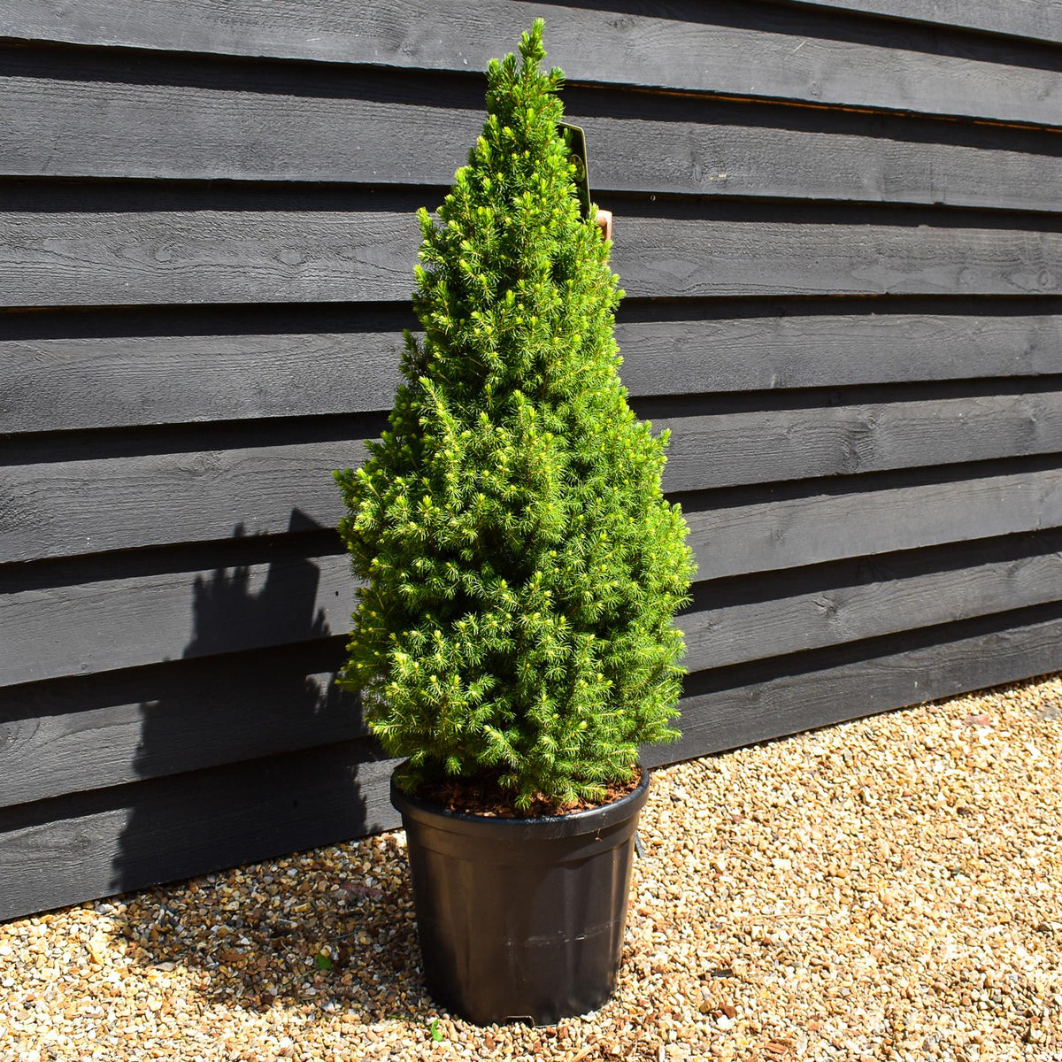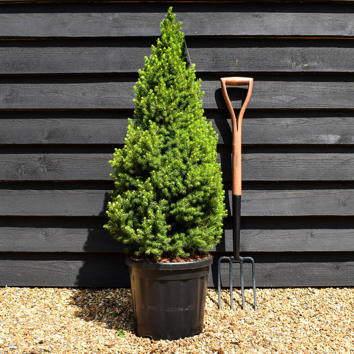This tree is hardy and well-suited to the UK climate, tolerating cold winters and thriving in a range of soil types, provided the soil is well-drained. It prefers full sun but can tolerate partial shade. Picea glauca ‘Perfecta’ is relatively low-maintenance, requiring minimal pruning, and it is also resistant to pests and diseases. Once established, it has moderate drought tolerance but benefits from regular watering during dry spells, especially when young.