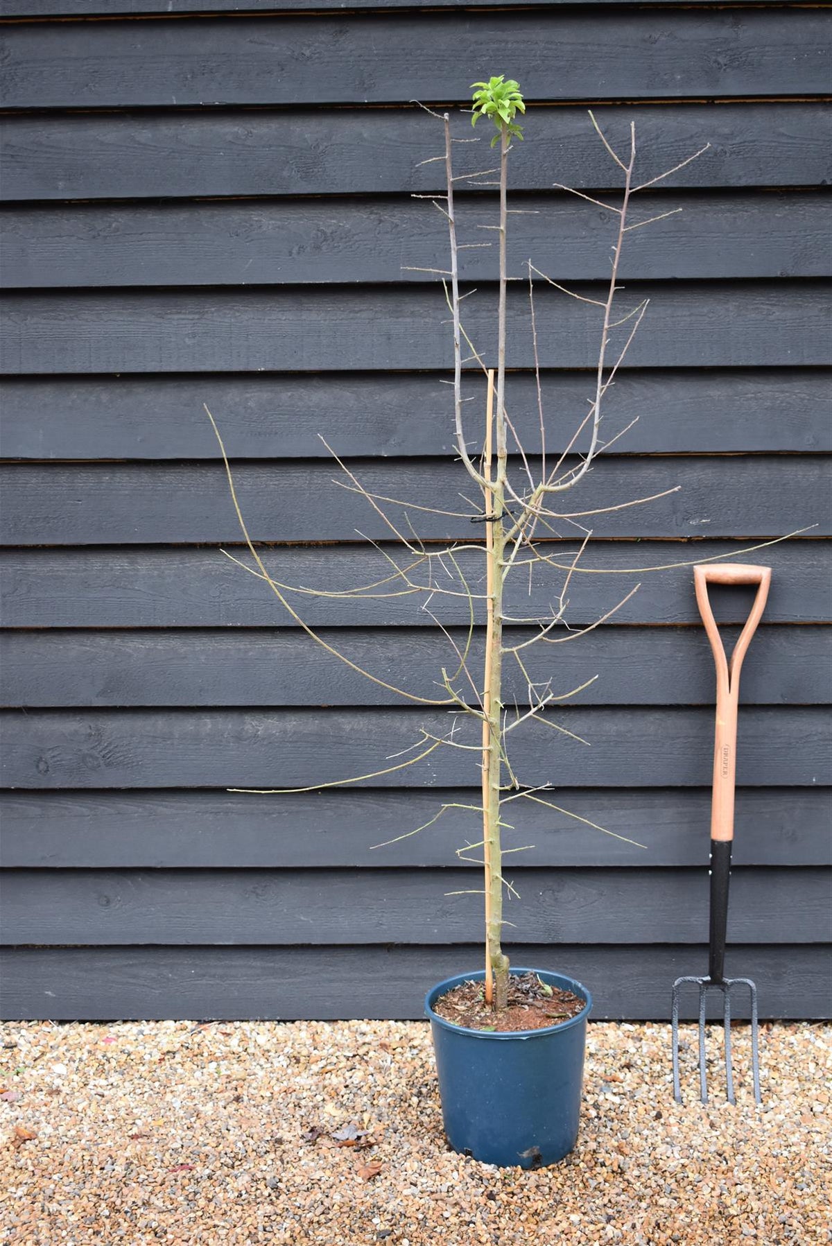 The Damson Shropshire Prune tree is a traditional English variety, highly prized for its fruit, which is small, dark purple, and rich in flavor. This damson variety has a long history in the UK, especially in the county of Shropshire, where it has been cultivated for centuries. The tree itself is relatively compact and hardy, making it well-suited to a range of growing conditions, including colder climates. It thrives in well-drained soils, preferring sunny locations, though it can tolerate partial shade.