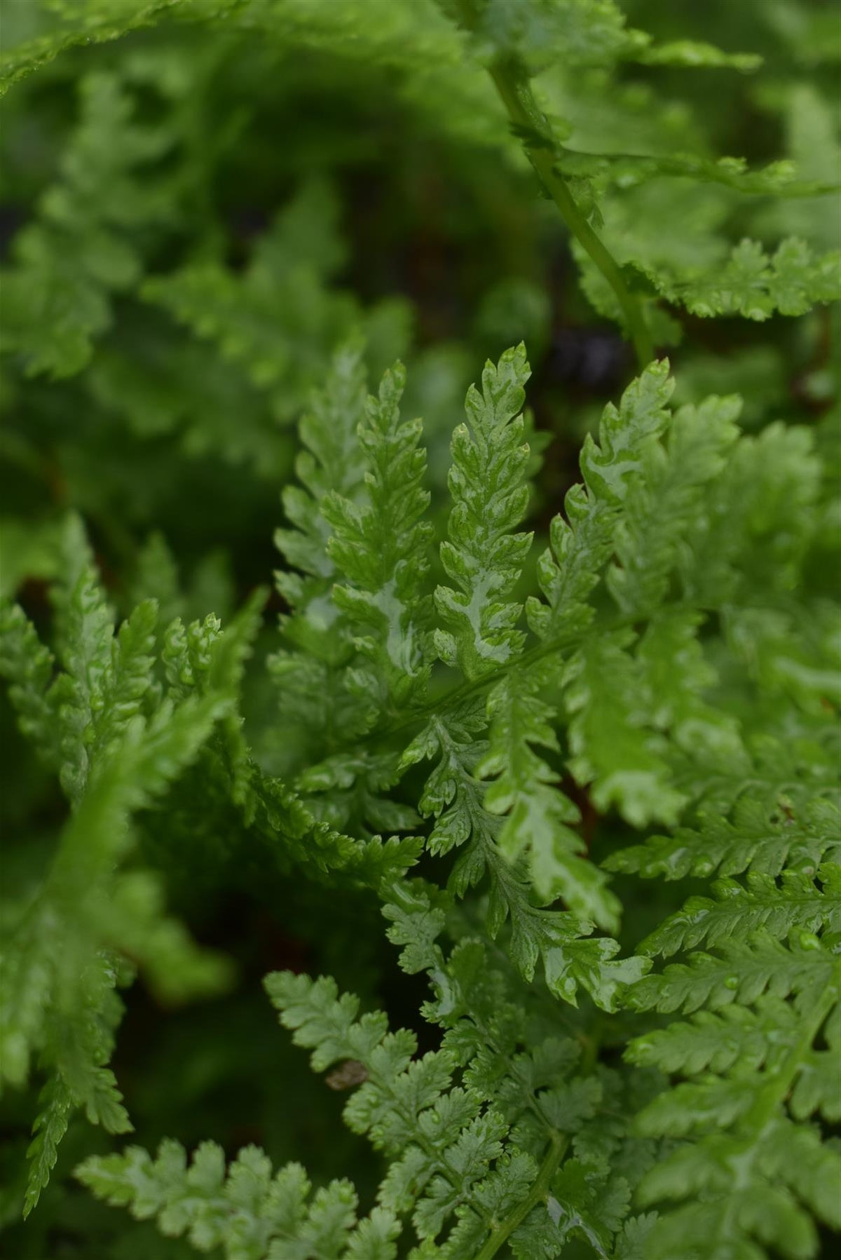 The 'Lady in Red' fern features feathery, finely divided fronds that can reach up to 60-90 cm in height, forming an elegant and graceful clump. The fronds are a rich, medium-green colour, providing a lush, verdant backdrop to the distinctive red to burgundy stems, which are the hallmark of this variety. This colouration is most intense in the early part of the growing season, gradually fading as the season progresses, but always retaining some level of its distinctive hue.