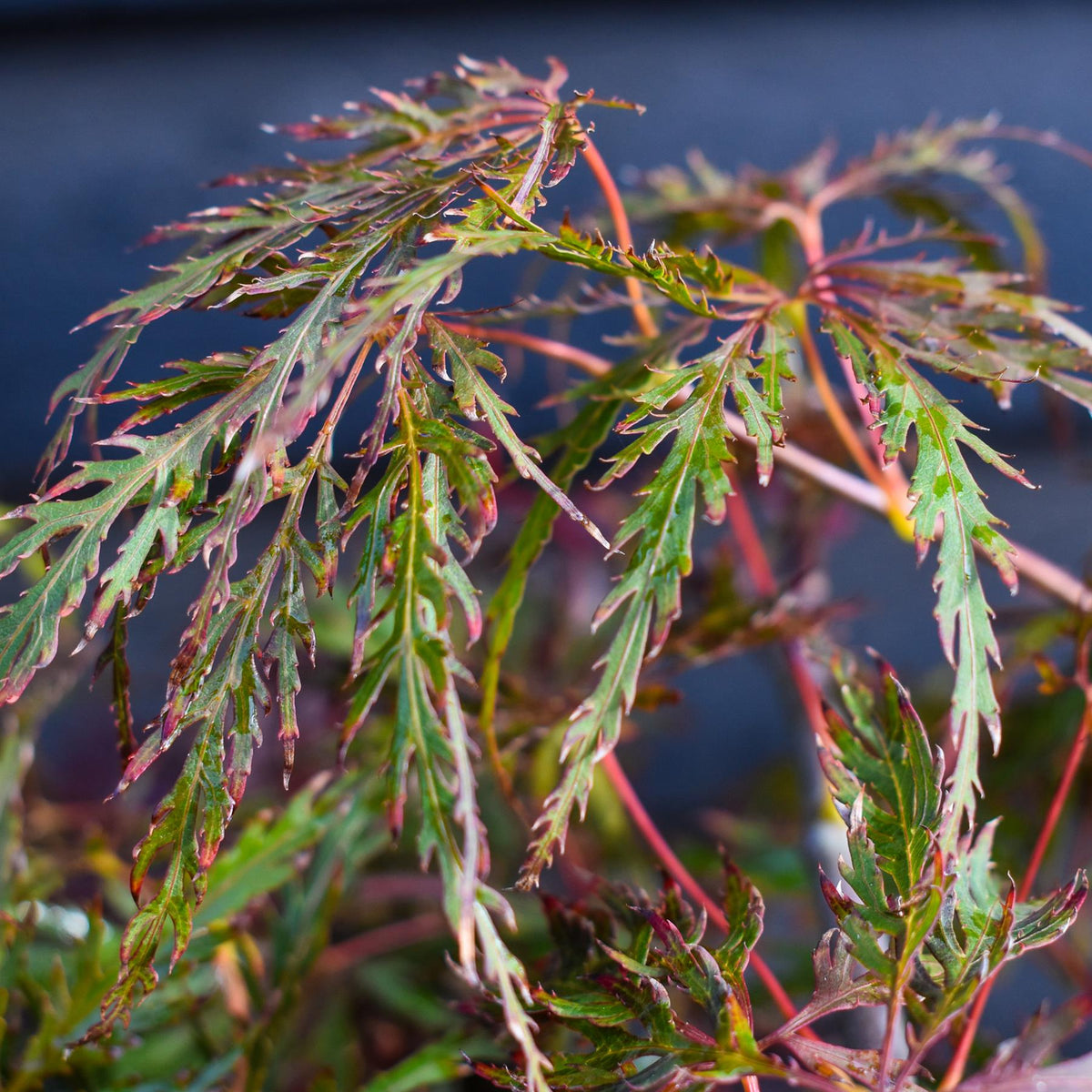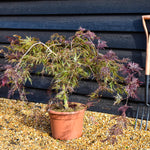 Acer palmatum 'Inaba-shidare' is a vigorous, slow-growing deciduous shrub with a pendulous, weeping habit. Feathery, deeply dissected, lobed, dark purple leaves, become crimson red in autumn. Its inconspicuous, purple-red flowers bloom in April and May and are followed by winged nuts. It can grow in every soil type, except chalk. Thrives best in moist, well-drained, slightly acidic soils. Although it prefers partial shade, it tolerates full sun very well. If planted on dry locations, the foliage colour may be less intense. Easy to care for. It requires very little pruning. Lack of soil moisture or excessive exposure can cause leaf scorch. Acer palmatum 'Inaba-shidare' is perfect as a focal point in a small garden. It looks stunning when planted by the pond because of the waterfall effect of its pendulous habit. It is also easily grown in containers and suitable for roof gardens or patio gardens.