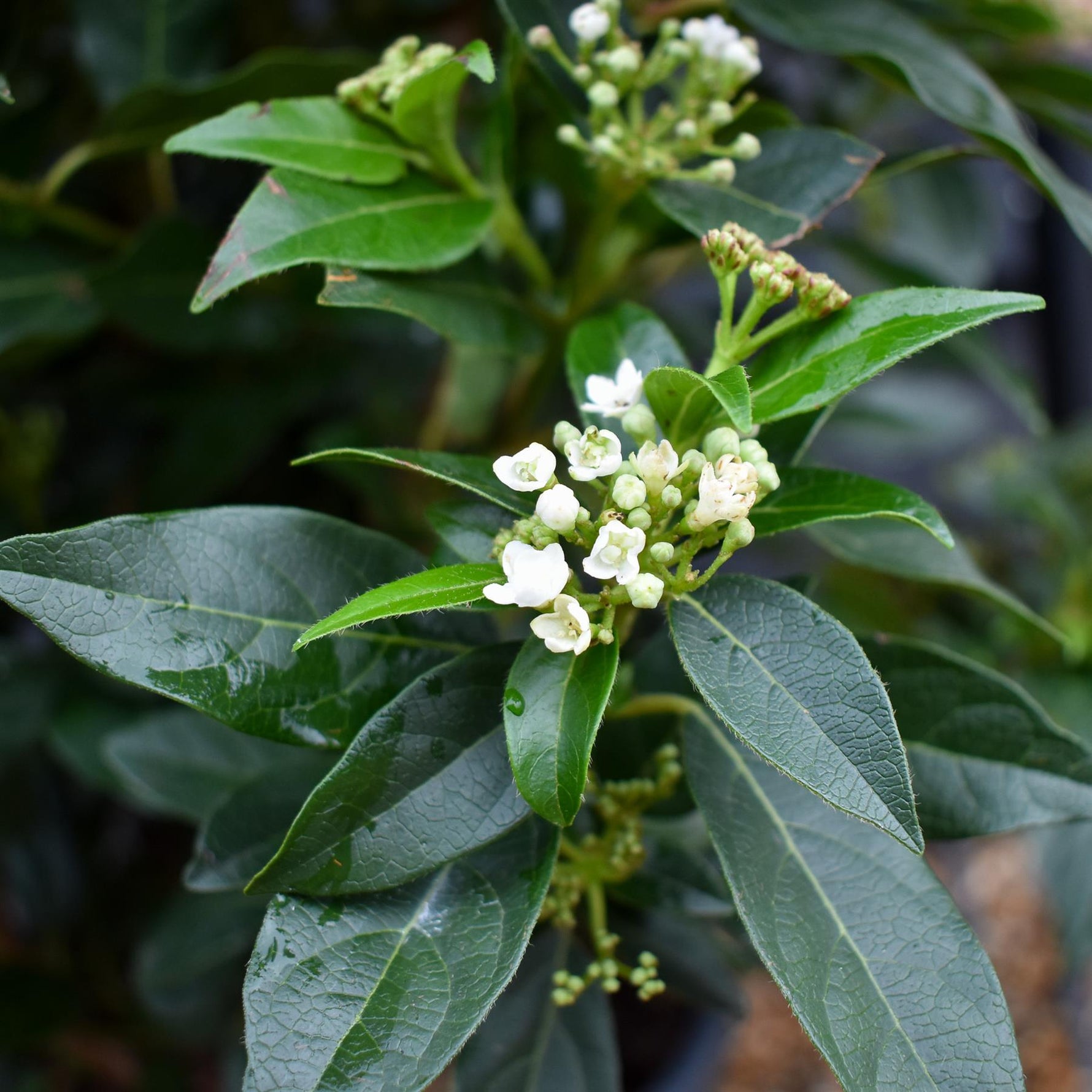 Viburnum tinus ‘Eve Price’ is a medium-sized, bushy, dense, winter-flowering, evergreen shrub with leathery, broadly oval, dark green leaves, and cluster of small, starry, white flowers opening form deep pink buds and blooming from December to March. Flowers are followed by ornamental, glossy, dark blue berries.