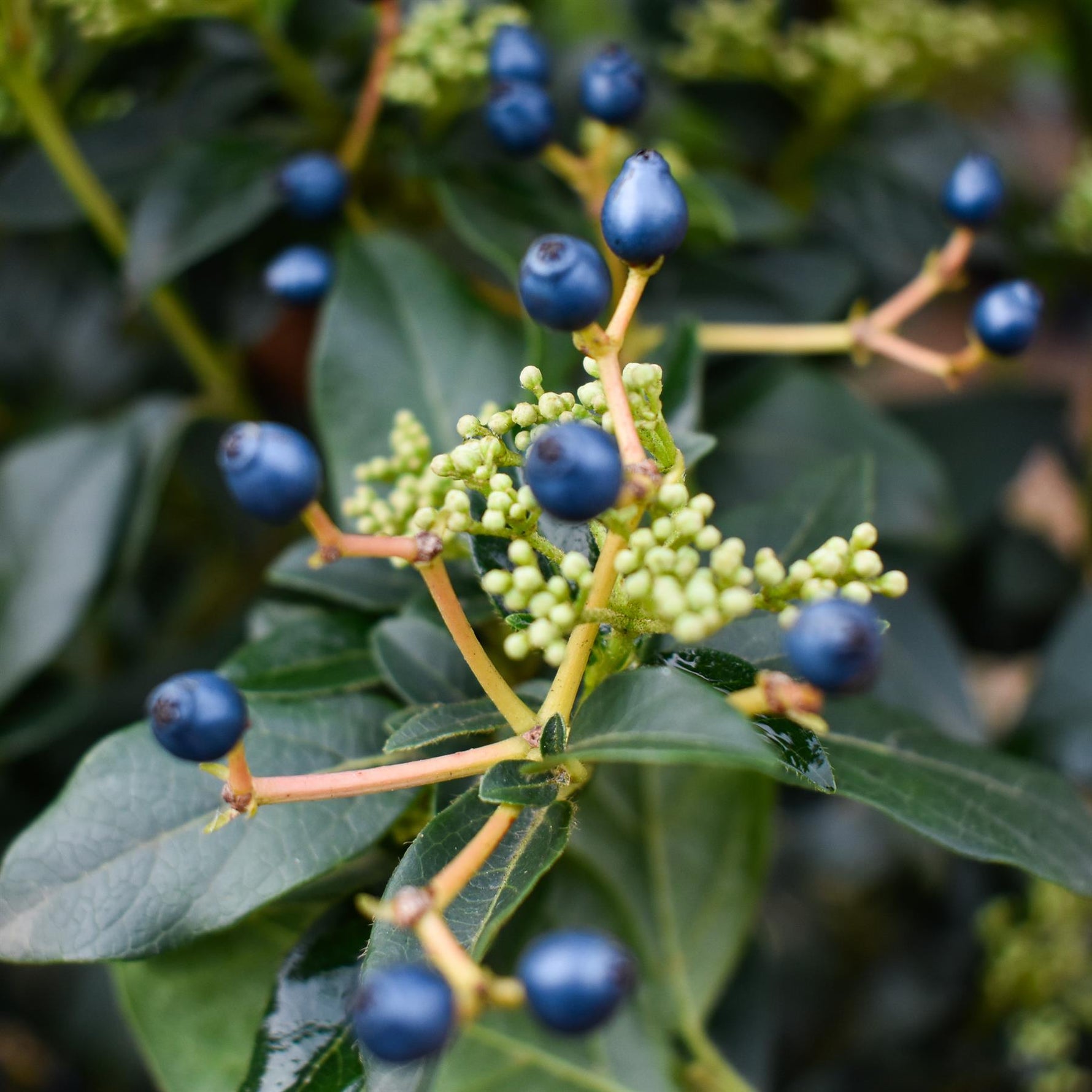 Viburnum tinus ‘Eve Price’ is a medium-sized, bushy, dense, winter-flowering, evergreen shrub with leathery, broadly oval, dark green leaves, and cluster of small, starry, white flowers opening form deep pink buds and blooming from December to March. Flowers are followed by ornamental, glossy, dark blue berries.
